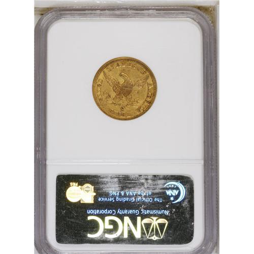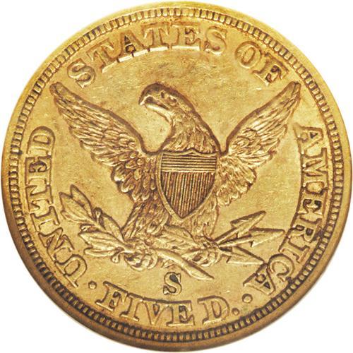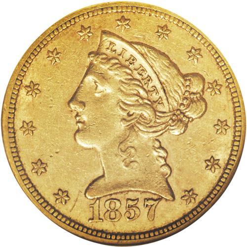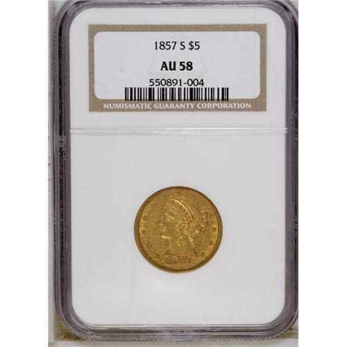 1857-S $5 AU58 NGC. Well struck for the No Motto type,