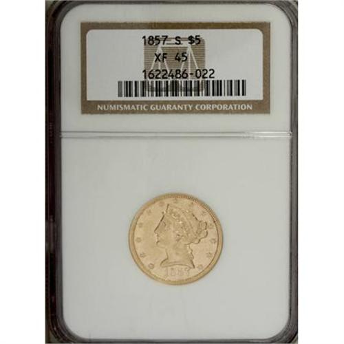 <B>1857-S $5 XF45 NGC.</B></I> This pale straw-gold half eagle retains surprising radiance on each side. Light, even wear affects the softly struck devices and the moderately abraded fields. Still, a pleasing example of this low-mintage San Francisco issue.<BR><BR><B>Coin Engraver:</B> Christian Gobrecht<BR><BR><b>Shipping:</b> Coins & Currency (<a target="_blank" href="http://www.heritageauctions.com/common/shipping.php">view shipping information</a>)