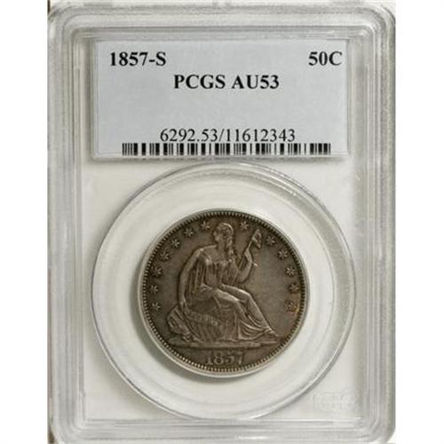 <B>1857-S 50C AU53 PCGS.</B></I> Golden-gray toning is slightly deeper on the reverse of this AU53 half, and sharp definition characterizes the design elements. A few minute marks are not disturbing. Randy Wiley and Bill Bugert (1993) assign a low R.5 rating to XF/AU examples, though AU53 coins are probably close to R.7.<BR><BR><B>Coin Engraver:</B> Christian Gobrecht<BR><BR><b>Shipping:</b> Coins & Currency (<a target="_blank" href="http://www.heritageauctions.com/common/shipping.php">view shipping information</a>)