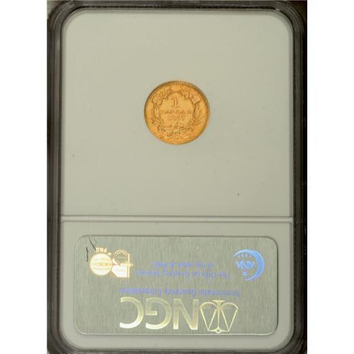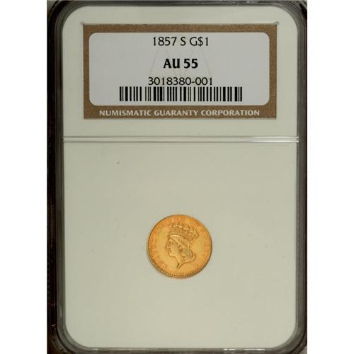 <B>1857-S G$1 AU55 NGC.</B></I> Gold issues from the San Francisco Mint's first few decades of production often tend to be condition scarcities and the 1857-S gold dollar, one of just 10,000 pieces struck, is no exception. This minimally worn representative retains considerable luster and displays attractive reddish accents. Census: 15 in 55, 48 finer (11/06).<BR><BR><b>Shipping:</b> Coin/Currency (<a target="_blank" href="http://www.heritageauctions.com/common/shipping.php">view shipping information</a>)