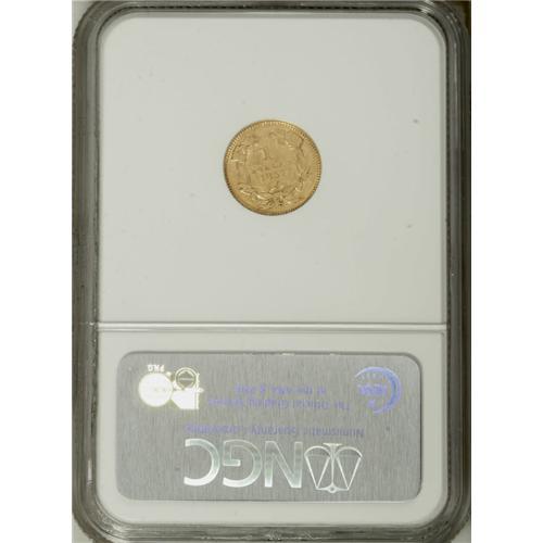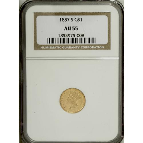 <B>1857-S G$1 AU55 NGC.</B></I> The 1857-S is scarcer than its 10,000-piece mintage would indicate, especially in higher grades. This yellow-gold Choice AU specimen displays traces of luster in the recessed areas, and is generally well struck. A sharp S-mint gold dollar. Census: 16 in 55, 48 finer (1/07).<BR><BR><b>Shipping:</b> Coins & Currency (<a target="_blank" href="http://www.heritageauctions.com/common/shipping.php">view shipping information</a>)