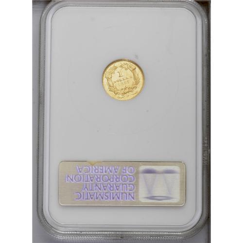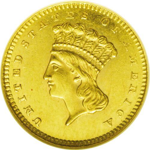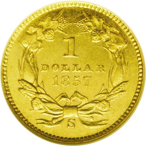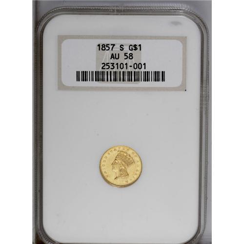 <B>1857-S<G$1> AU58 NGC.</B></I> This is a surprisingly scarce date in higher grades. The San Francisco Mint was concentrating on the production of double eagles at the time, and just 10,000 gold dollars were coined. Like most early S-Mint coinage, nearly all of these gold dollars immediately entered circulation. Probably not more than a couple dozen Mint State examples have survived, indicating the rarity of Choice AU and near-Mint coins such as this one. An attractive example featuring bright yellow-gold color, this gold dollar has reflective fields and pleasing surfaces with limited abrasions. Census: 31 in 58, 16 finer (7/06).