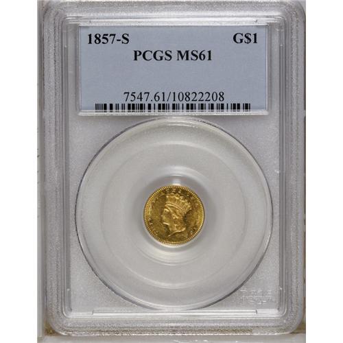 <B>1857-S G$1 MS61 PCGS.</B></I> Mint State examples are rarely encountered and this is a solid coin for the grade. Bright yellow-gold is evenly distributed over both sides. The strike is strong with some orange peel affect towards the reverse rims. This lustrous example will help build a premium date and mint set. Population: 1 in 61, 5 finer (10/06).<BR><BR><b>Shipping:</b> Coin/Currency (<a target="_blank" href="http://www.heritageauctions.com/common/shipping.php">view shipping information</a>)