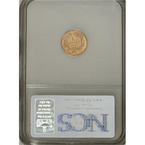 <B>1857-S G$1 --Damaged, Improperly Cleaned--NCS. Unc. Details.</B></I> A well struck but lightly cleaned gold dollar with a smattering of tiny obverse field marks. A tiny mintage of 10,000 pieces confirms the rarity of this gold rush issue.<BR><BR><B>Coin Engraver:</B> James B. Longacre<BR><BR><b>Shipping:</b> Coins & Currency (<a target="_blank" href="http://www.heritageauctions.com/common/shipping.php">view shipping information</a>)