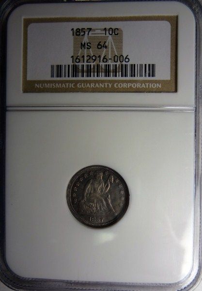 1857 SEATED DIME NGC MS64, SUPER COLOR!