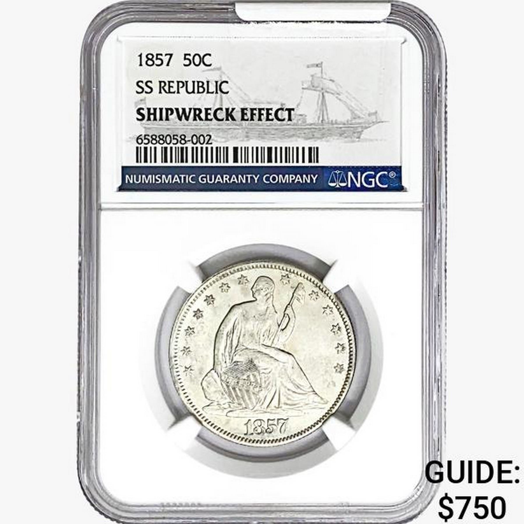 1857 Seated Lib. 50C NGC Shipwreck Effect SS REP.