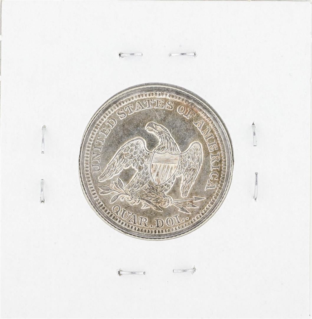 One 1857 Seated Quarter Silver Coin.