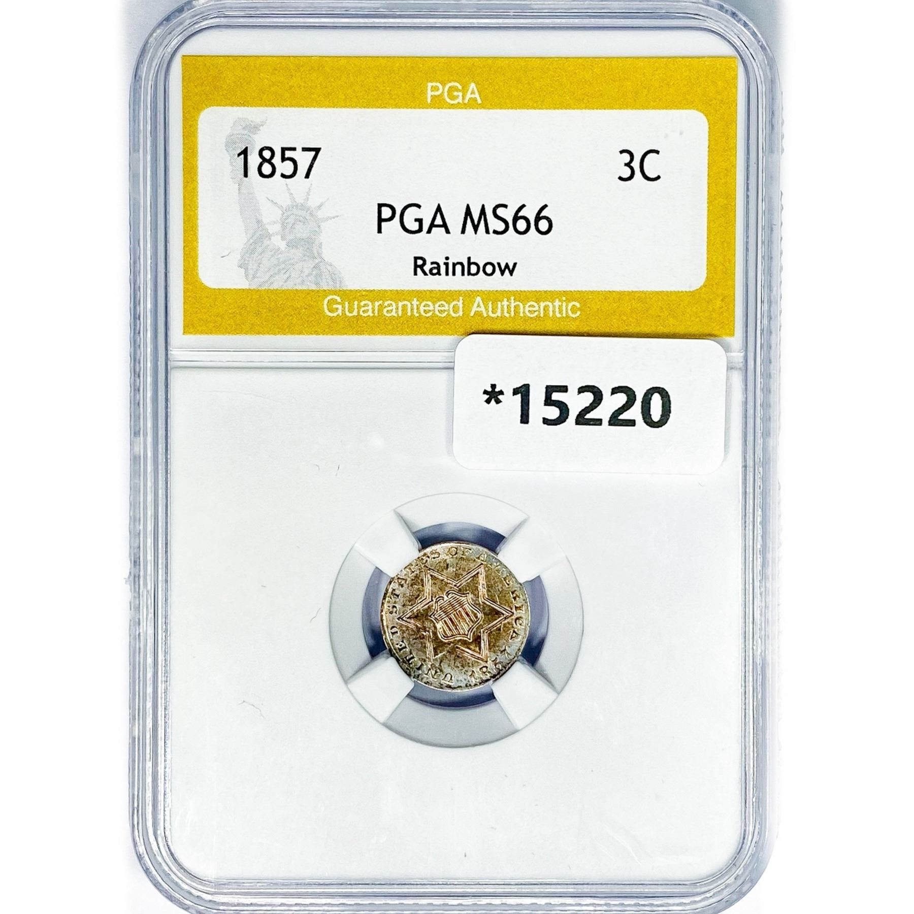 1857 Silver Three Cent PGA MS66 Rainbow