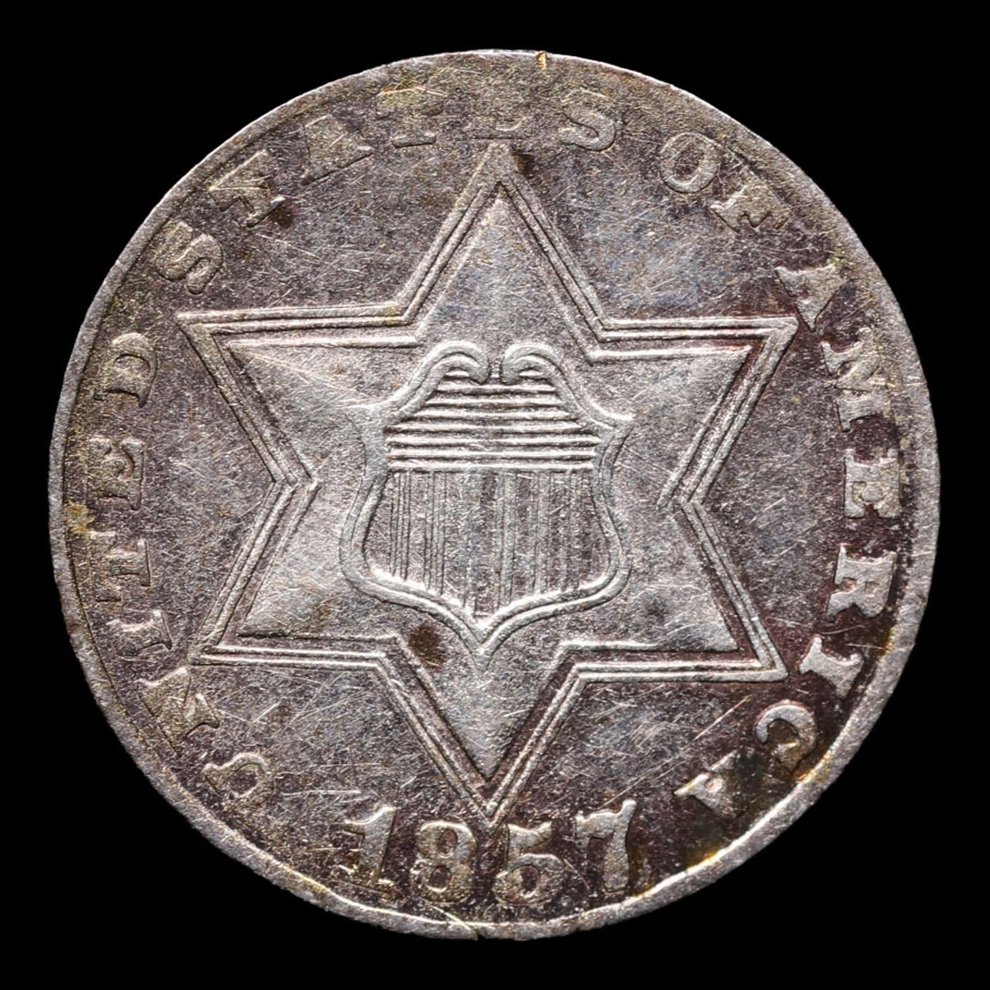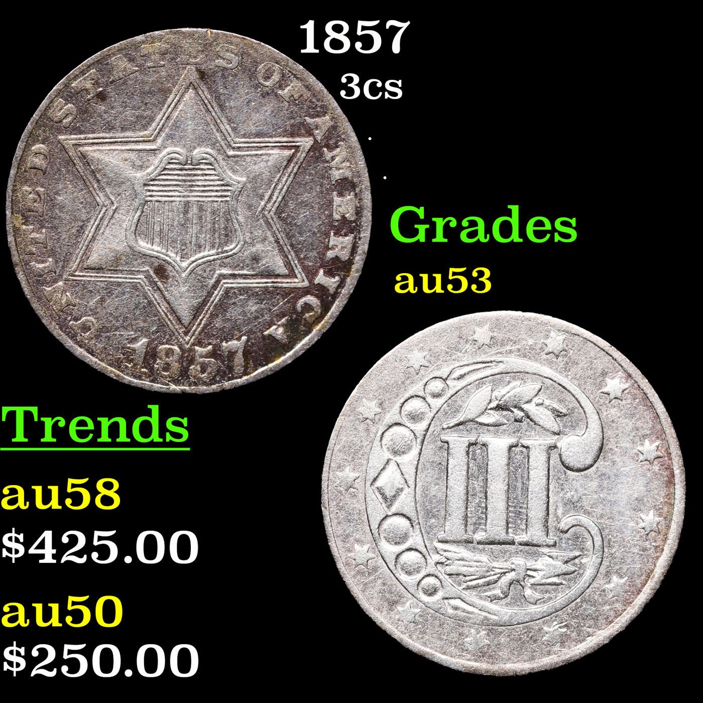 1857 Three Cent Silver 3cs Grades Select AU.