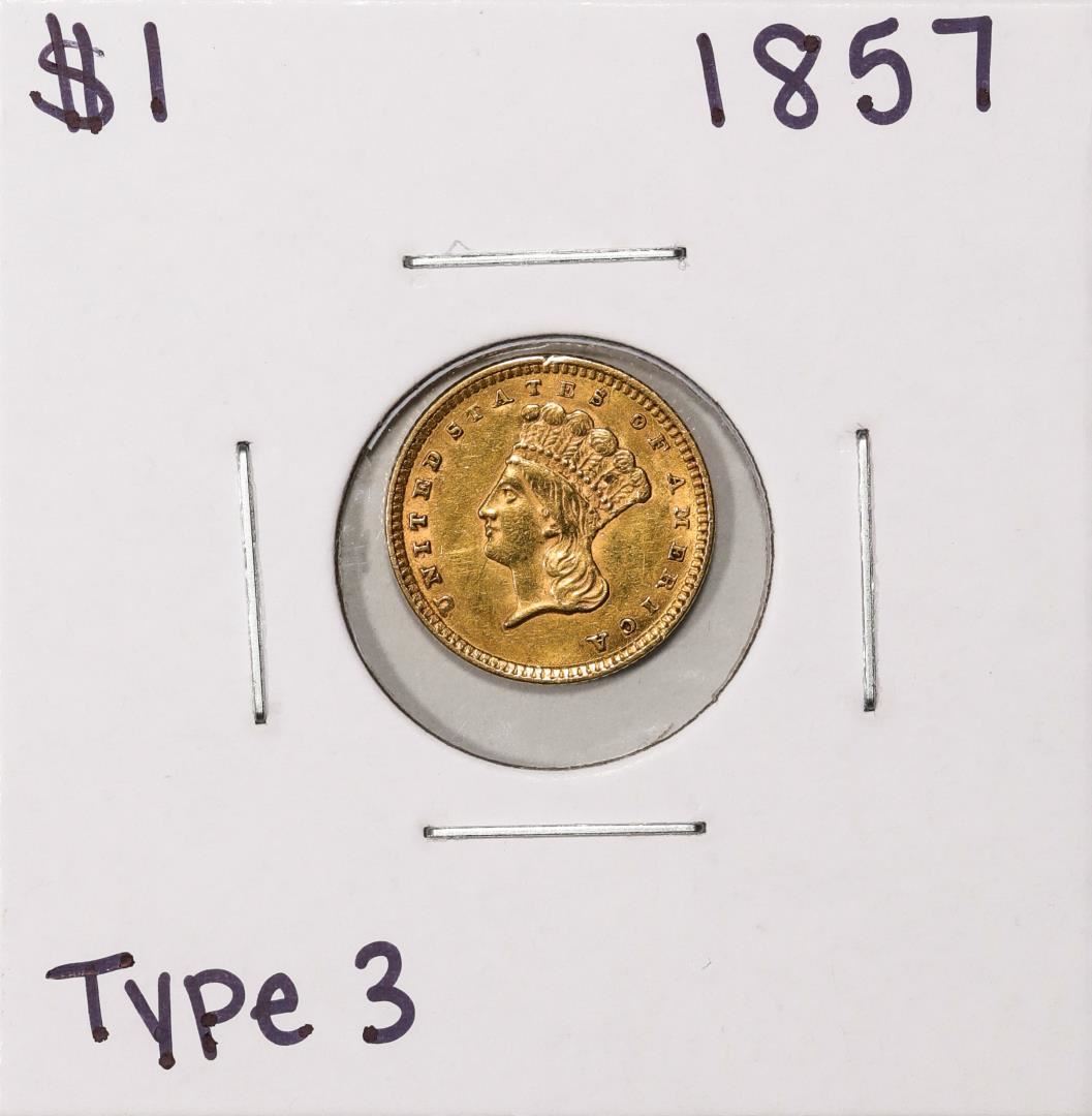 One 1857 Type 3 $1 Indian Princess Head Gold Dollar Coin.