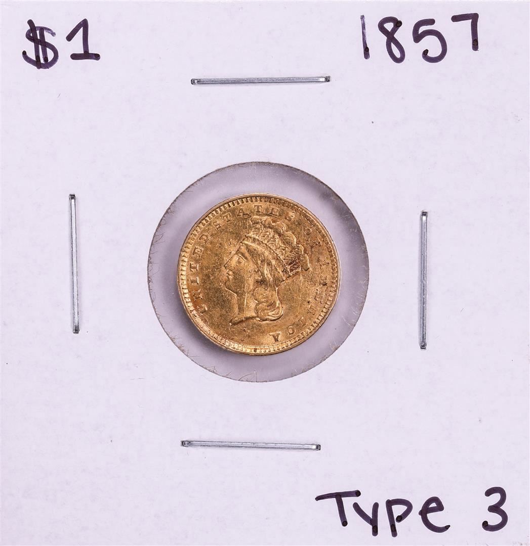One 1857 Type 3 $1 Liberty Head Gold Dollar Coin.