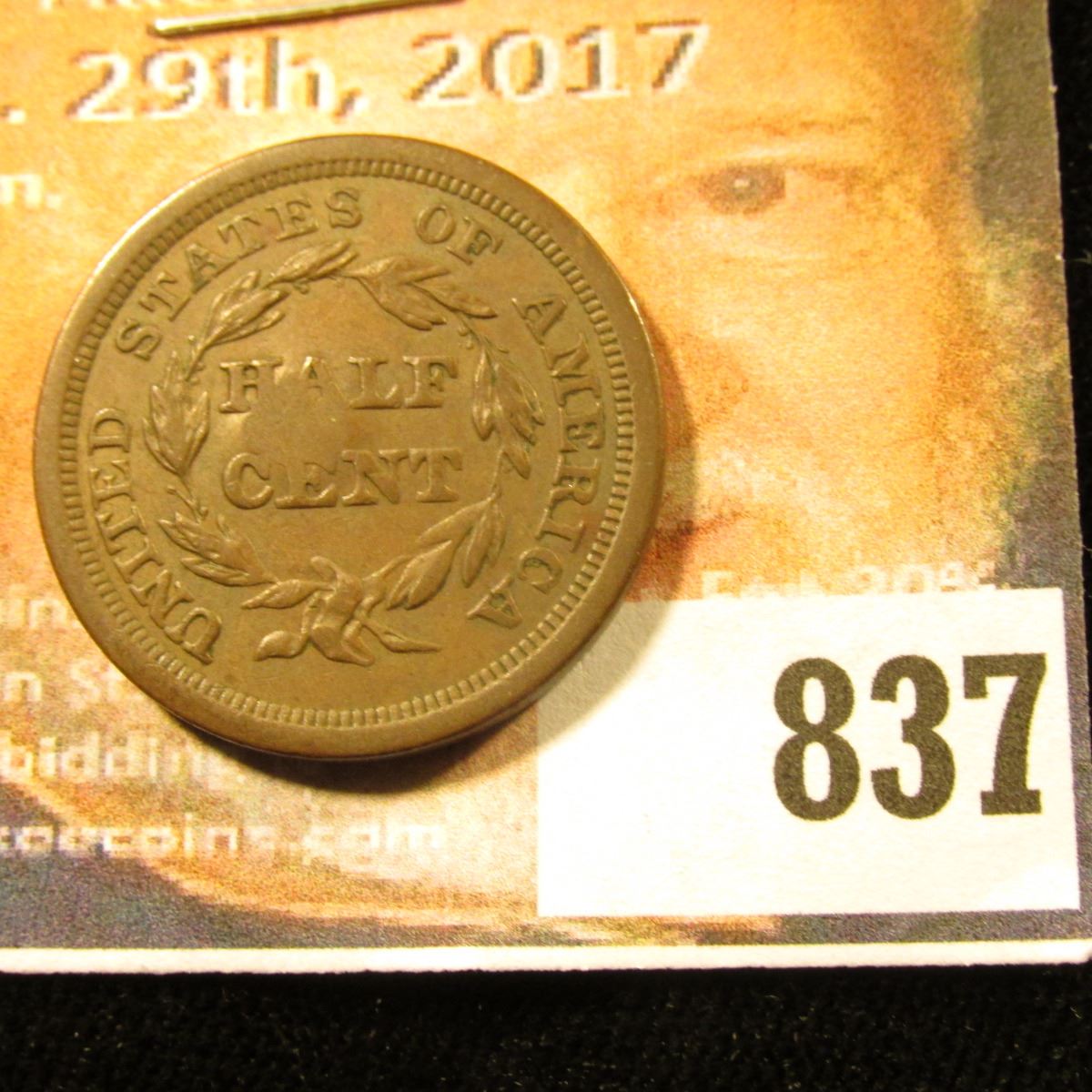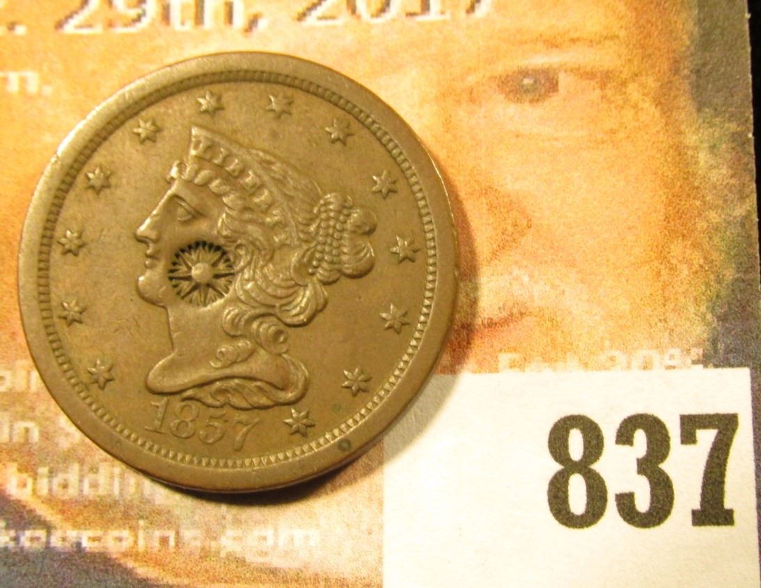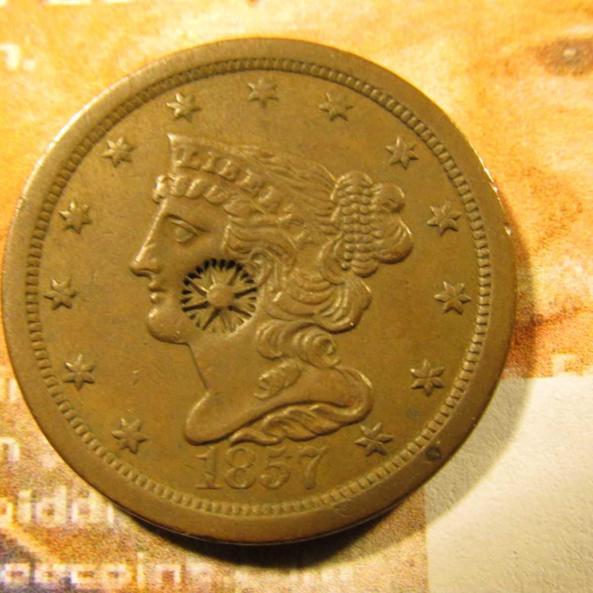 1857 U.S. Half Cent, EF with a very unique counterstamp of a Mum in the center of the obverse.