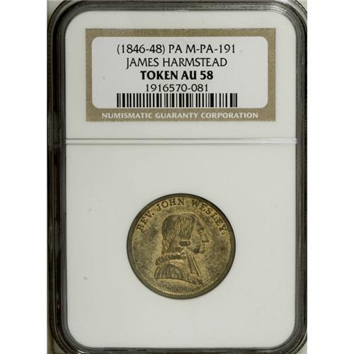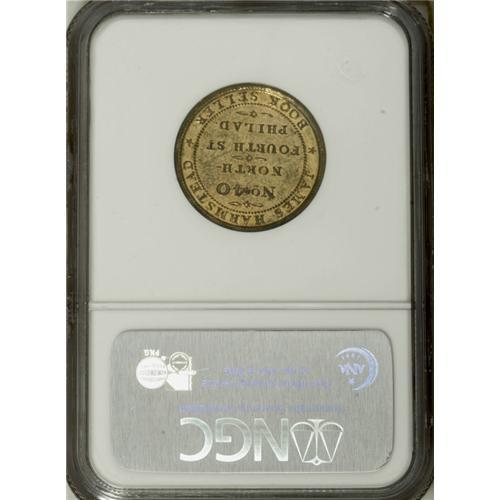 <B>(1857) W.A. Drown & Co., Philadelphia, PA, MS64 NGC,</B></I> M-PA-134, a pleasantly smooth olive-gold and champagne-rose piece; and an <B>(1846-48) James Harmstead, Philadelphia, PA, AU58 NGC,</B></I> M-PA-191, blended yellow-gold and steel-gray tones, a hair-thin line on the cheek.<BR><BR><b>Shipping:</b> Coin/Currency (<a target="_blank" href="http://www.heritageauctions.com/common/shipping.php">view shipping information</a>)