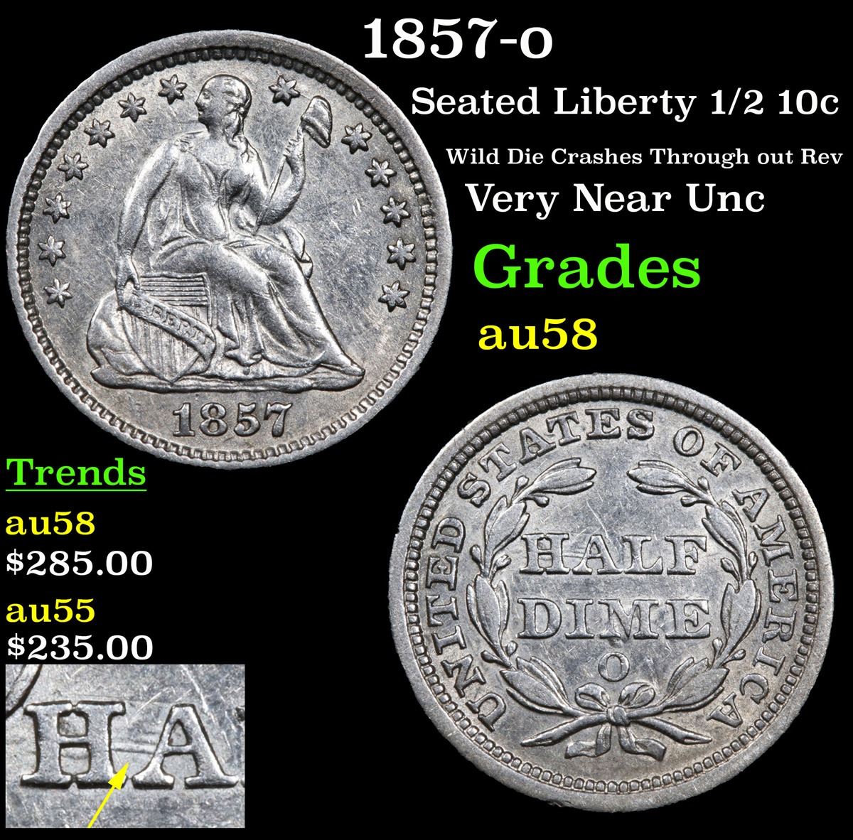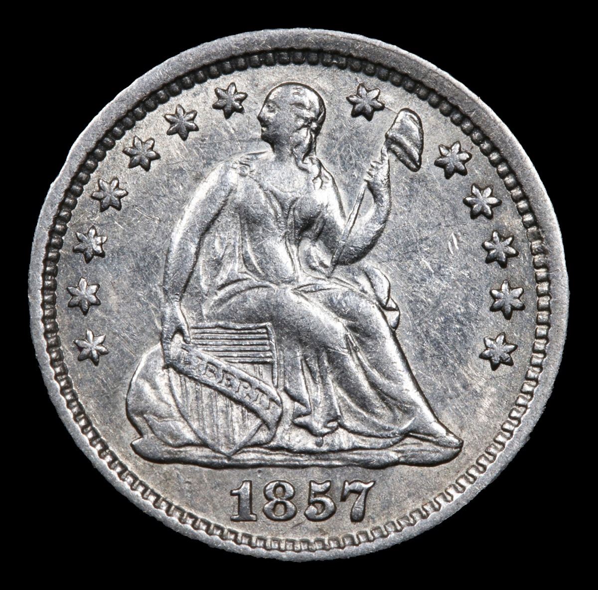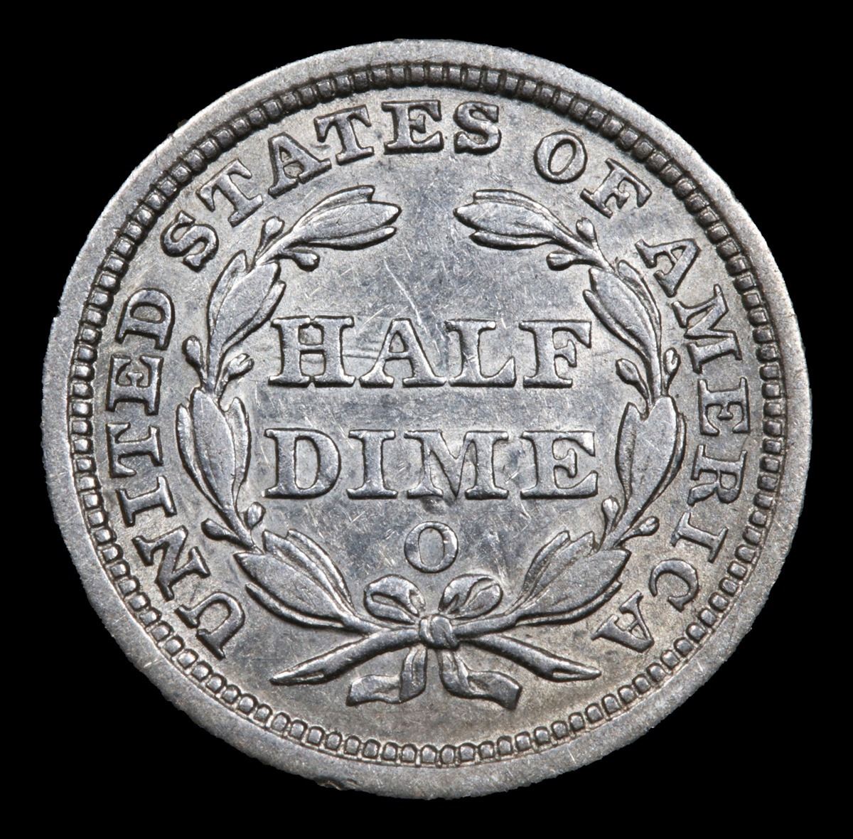1857-o Seated Liberty Half Dime 1/2 10c Grades Choice AU/BU Slider.