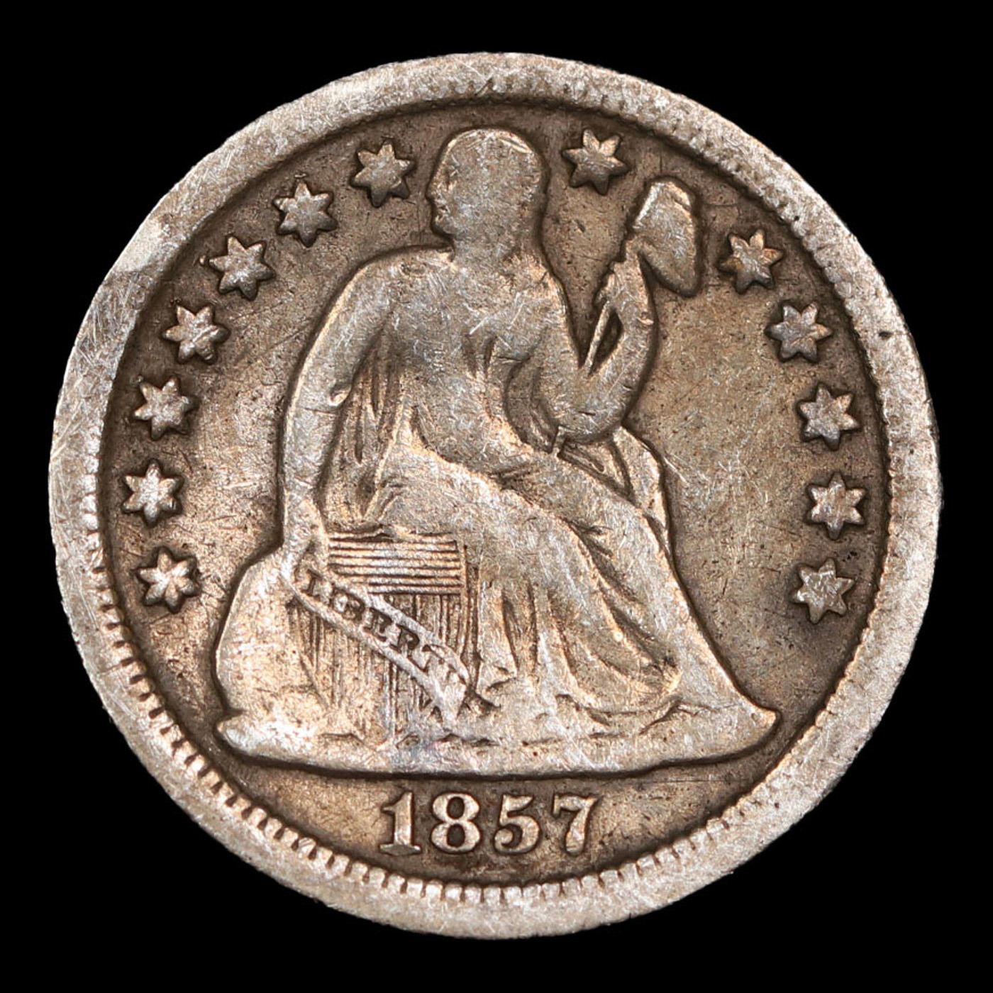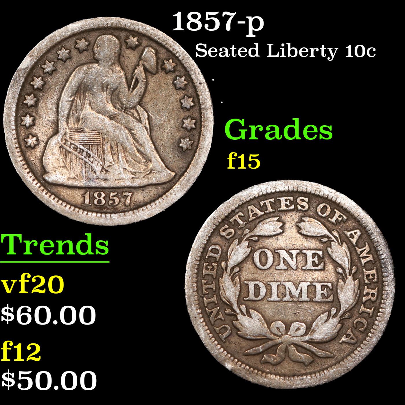 1857-p Seated Liberty Dime 10c Grades f+.