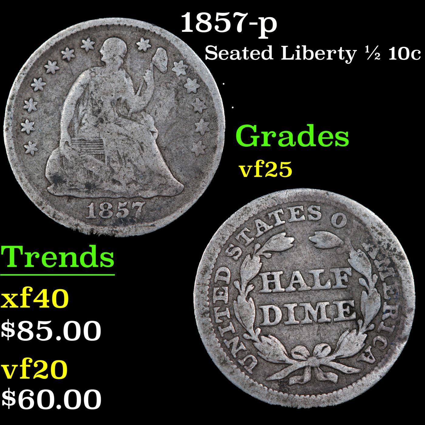 1857-p Seated Liberty Half Dime 1/2 10c Grades vf+.