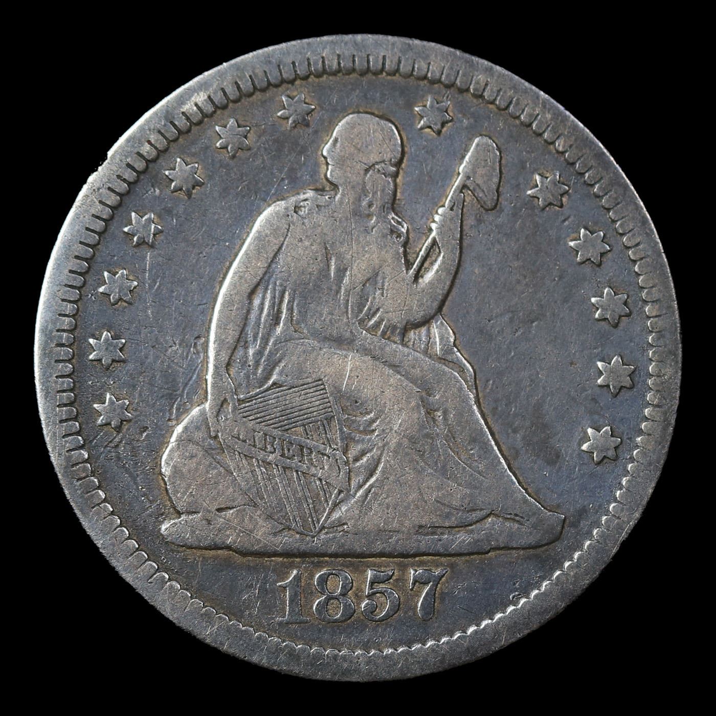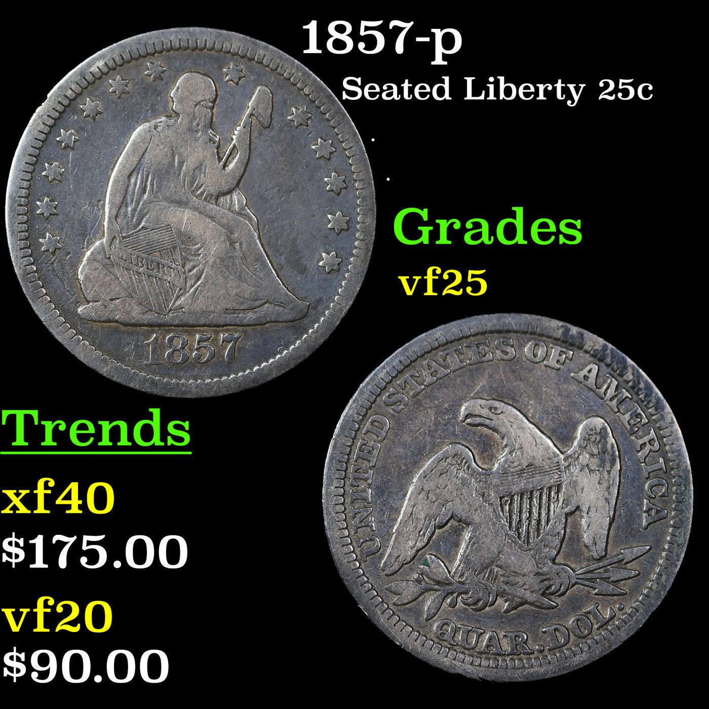 1857-p Seated Liberty Quarter 25c Grades vf+.