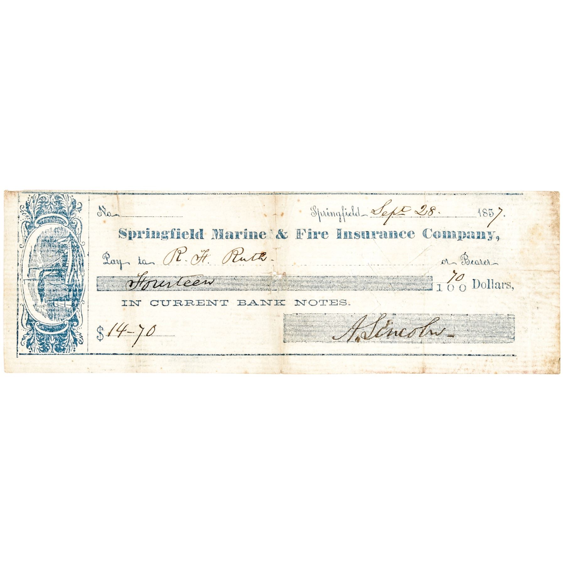 Abraham Lincoln Signed “Springfield Marine & Fire Insurance Company” Personal Check “In Bank Notes”