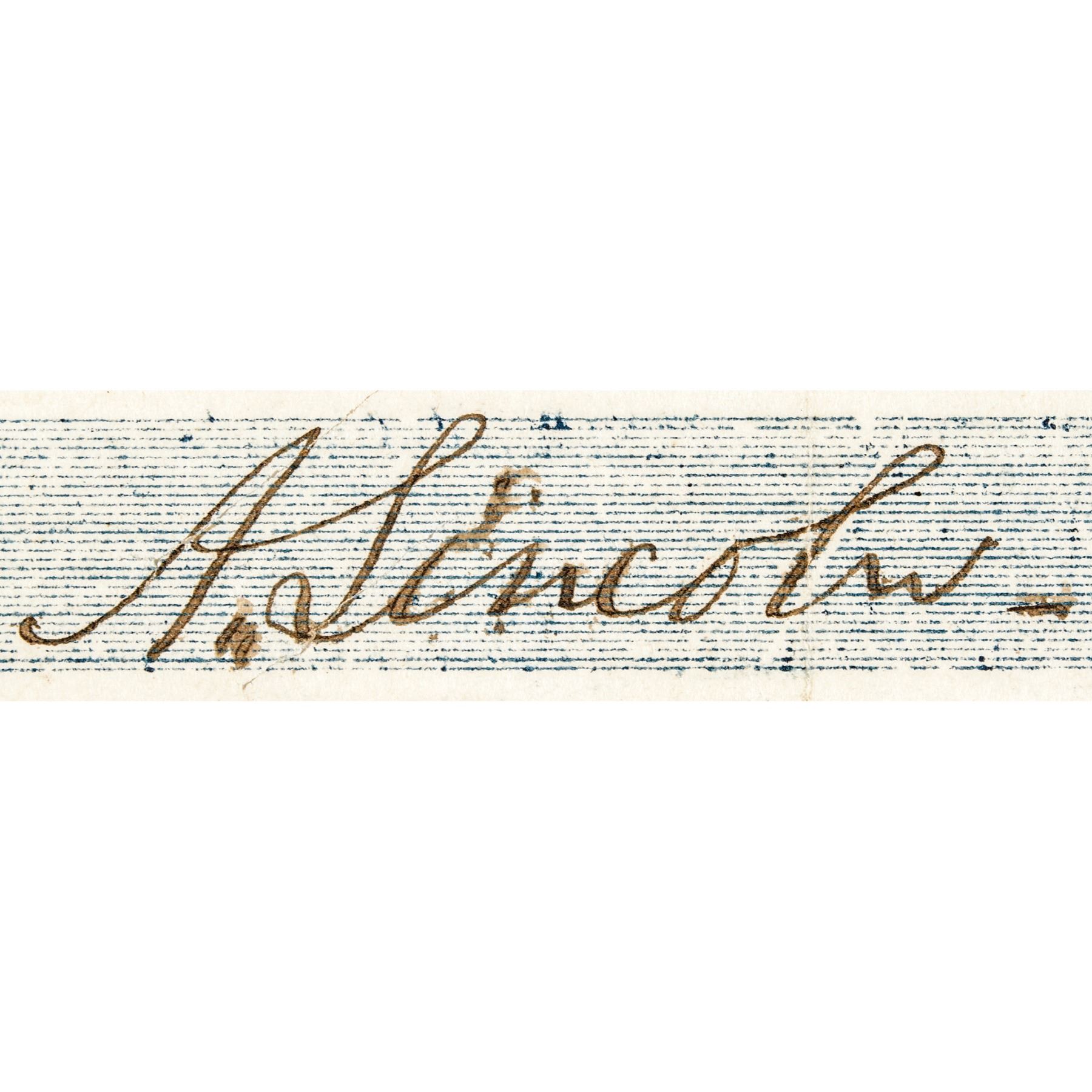 September 28, 1857-Dated, Partly-Printed Document, Personal Check Signed, “A. Lincoln”, 1 page, measures about 7.5” x 2.5”, Springfield (IL), Very Fine. A rare Abraham Lincoln Signed “Springfield Marine & Fire Insurance Company” Personal Check. Fine cut cancels well above and not affecting Lincoln’s signature, central spindle hole, some trivial pinholes, worn along the vertical fold, some edge soiling. This historic Check has top and bottom border lines with a left margin printed vignette of a Sailing Ship along with a closer Steam powered ship. Being a Bank Check printed in deep blue ink on off-white wove period paper, drawn on Lincoln’s personal account at the “Springfield Marine & Fire Insurance Company” made out in the amount of “Fourteen 70/100 Dollars,” in payment to “R.F. Ruth.” The signature of the future President, “A. Lincoln” is well written in rich brown ink measuring about 1.75” long within the light blue signature block at lower right.
