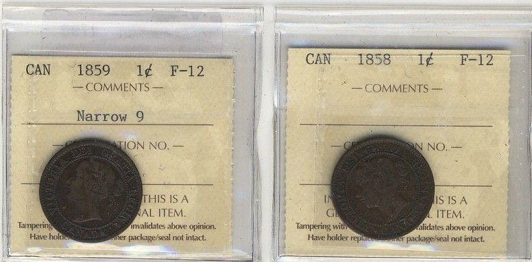 1858 1¢ & 1859 N9 ICCS F12. Lot of 2 coins.