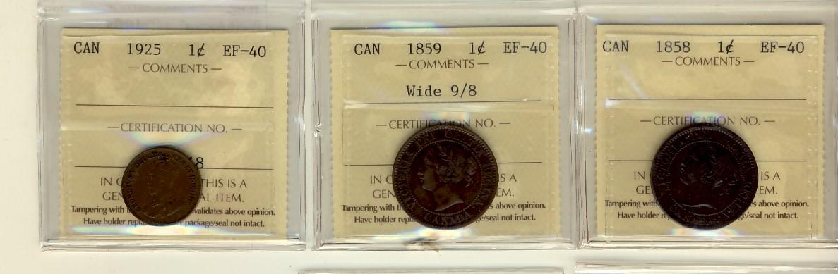 1858 1¢, 1859 W/9/8 & 1925 ICCS EF40. Lot of 3 key dates.
