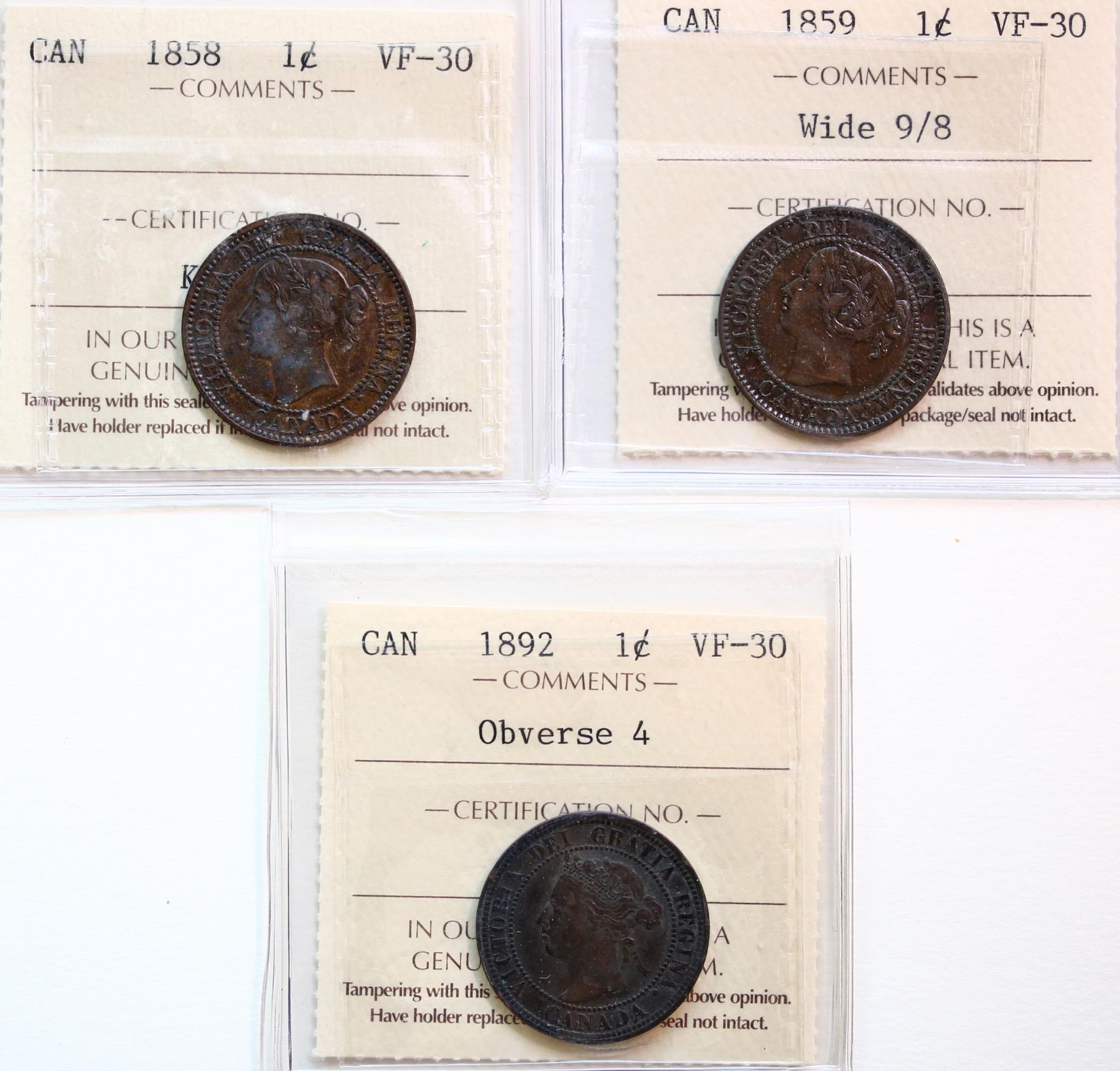 1858 1¢, 1859 " W9/8", 1892 "Obv.4". Lot of 3 coins all ICCS Choice Very Fine-30