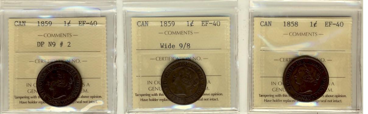 1858 1¢, 1859 W9/8 & DP N9 #2 ICCS EF40. Lot of 3 coins.