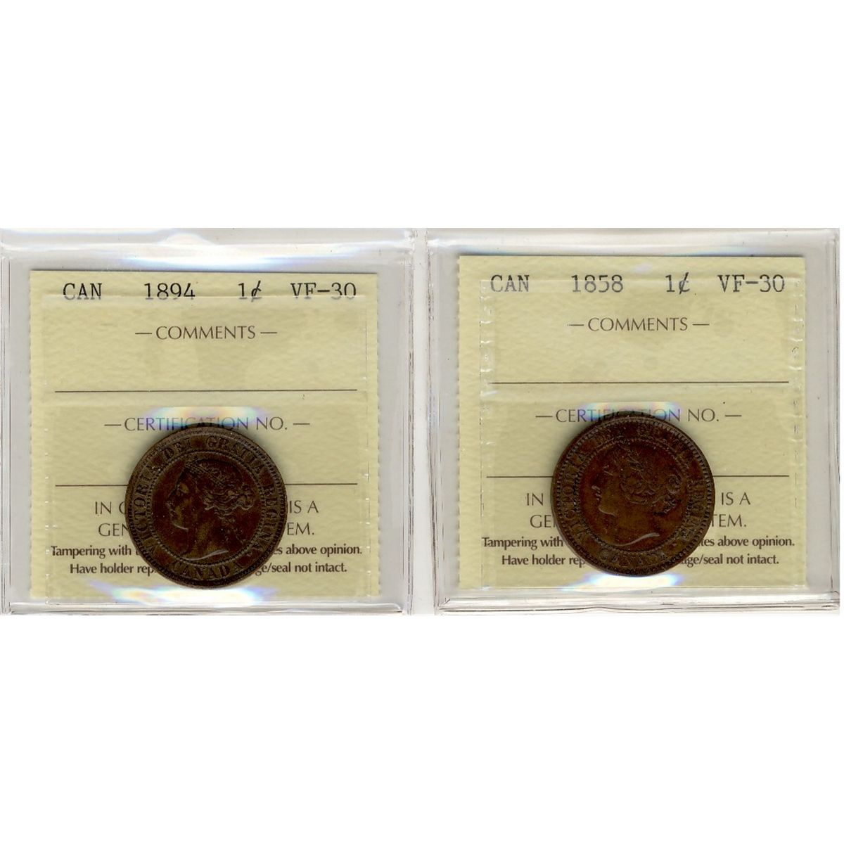 1858 1¢ & 1894 ICCS VF30. Lot of 2 coins.