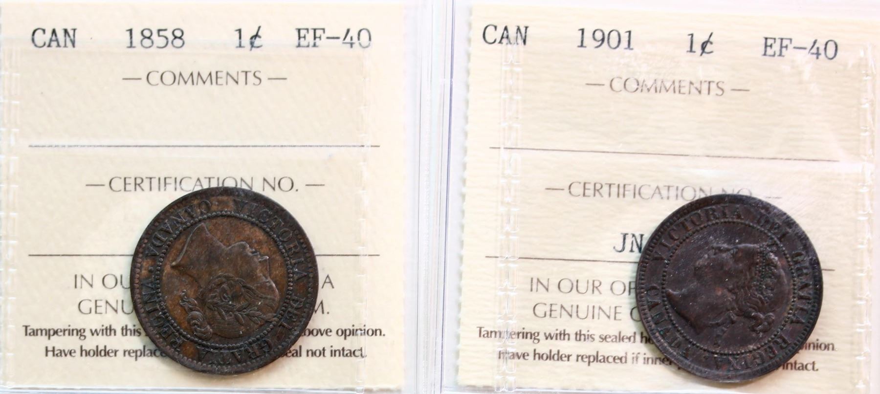1858 1¢, 1901. Both coins ICCS Extra Fine-40