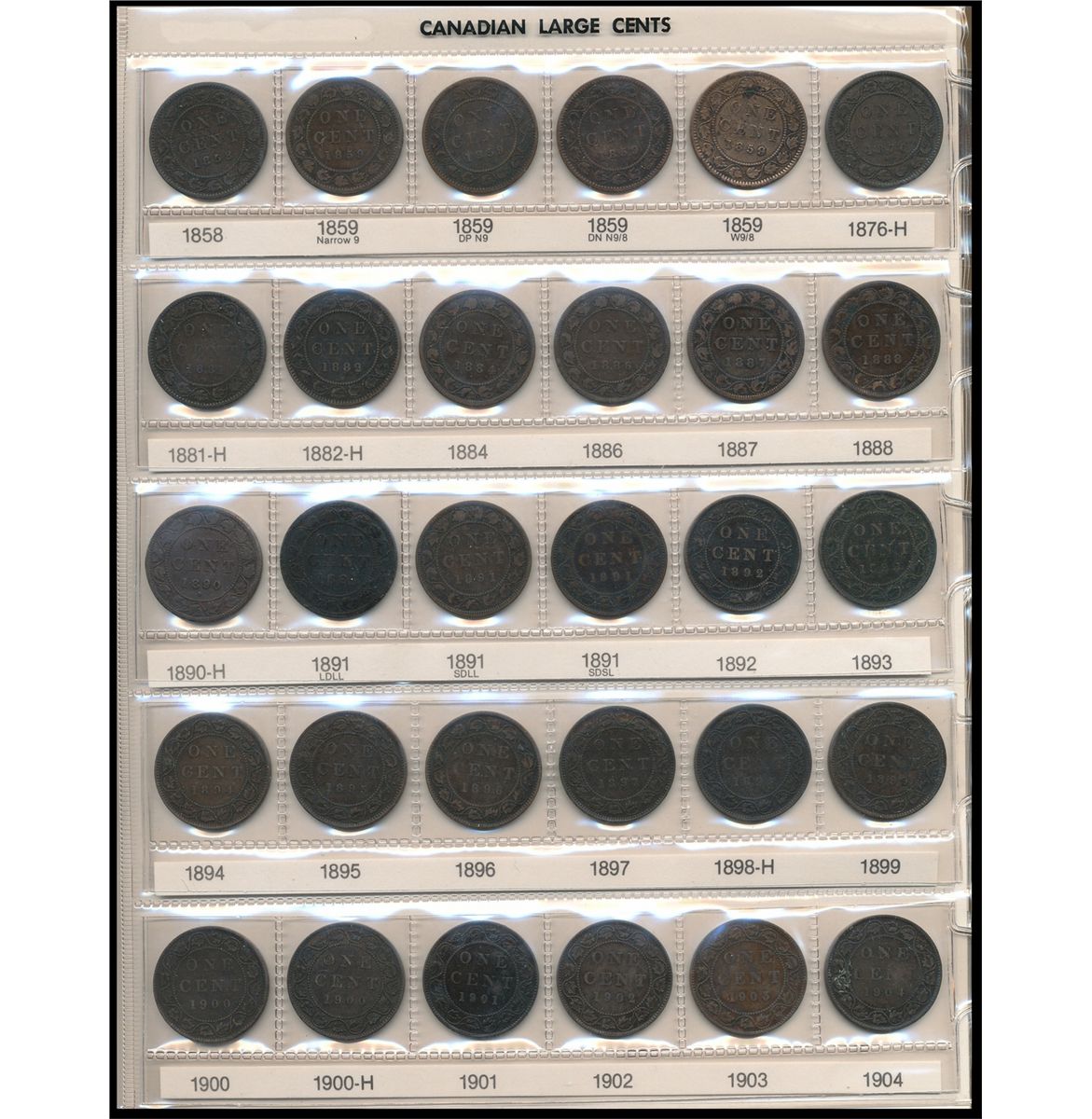 1858 1¢ - 1920 Complete Date Set; includes all dates and varieties with exception of the Brass 1859 example. A nice set of 47 pcs housed in Brown Uni-Safe album. Good to VF.