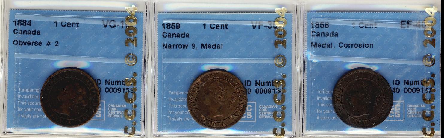1858 1¢ CCCS EF40 Corrosion 1859 N9 CCCS VF30 and 1884 1¢ Obv 2 CCCS VG10