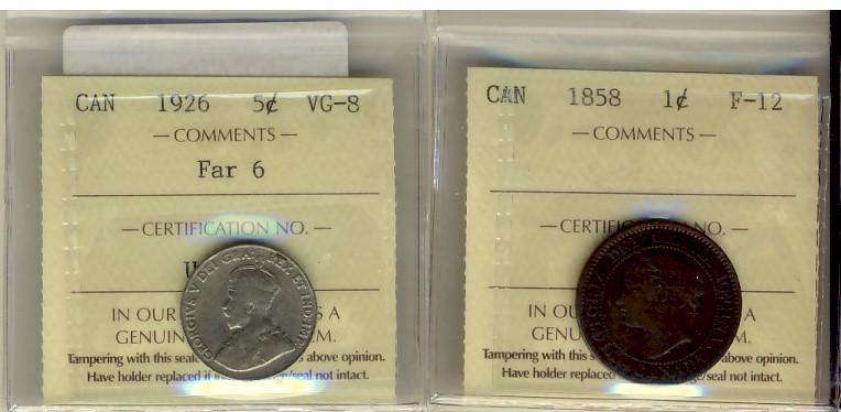 1858 1¢ F12 & 1926 Far 5¢ VG8. Lot of 2 ICCS graded coins.