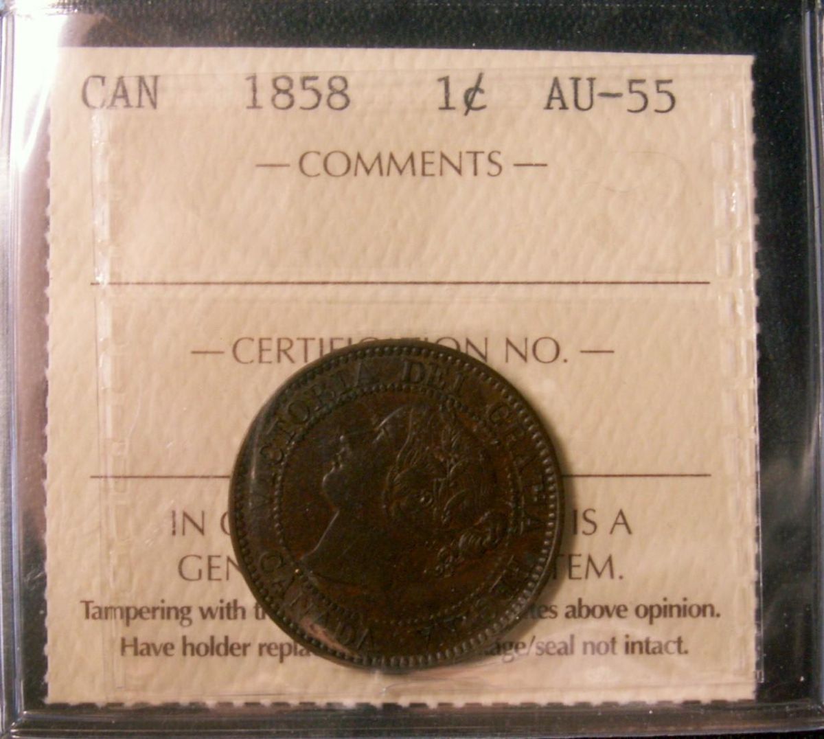 1858 1¢ ICCS AU55. A nice chocolate brown.
