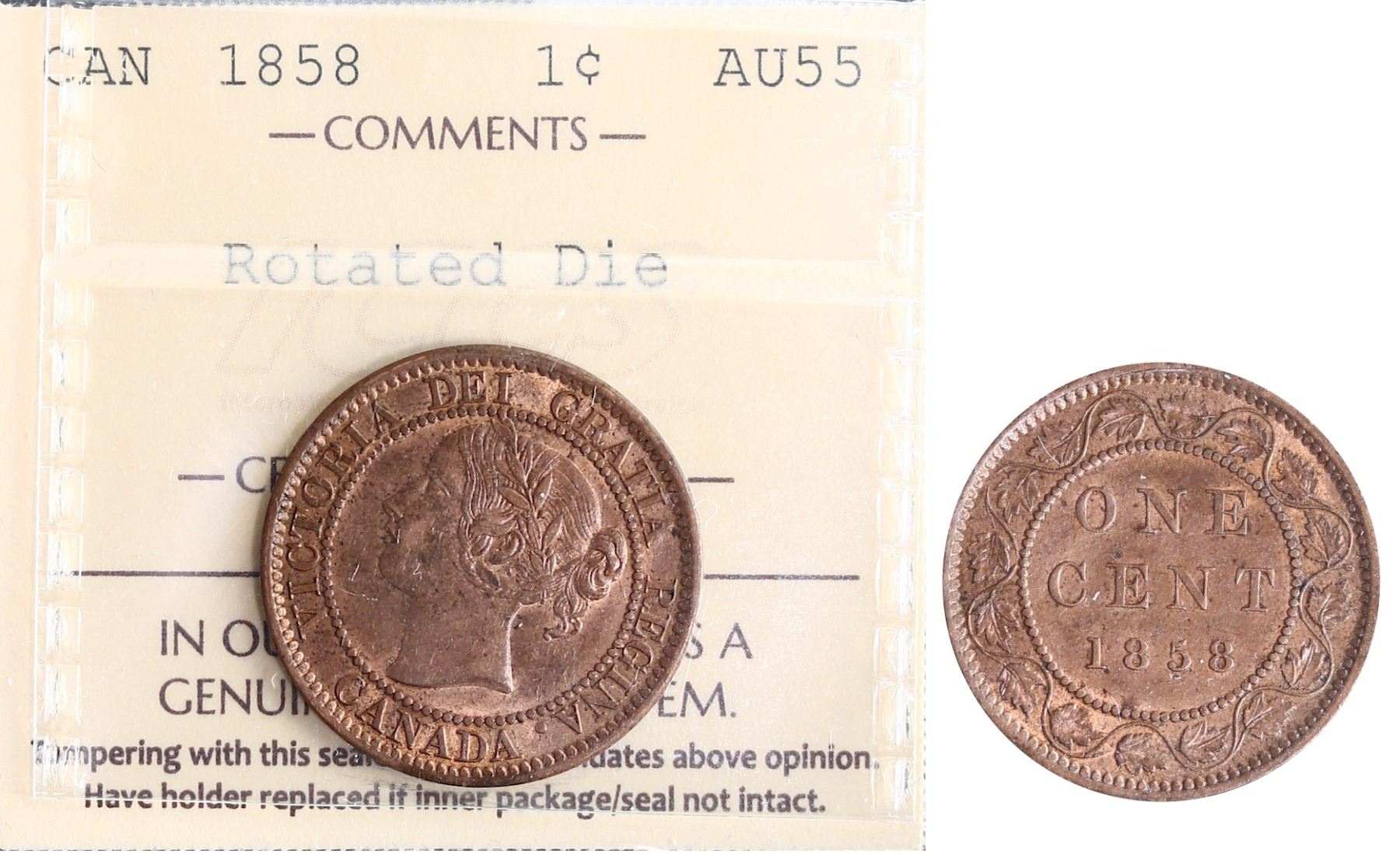 1858 1¢ ICCS Choice About Uncirculated-55, Designated as Rotated Die (20% Rotation), hints of red.