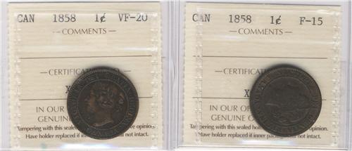 1858 1¢. Lot of two coins both ICCS graded, F15 and VF20. Both coins sharp with no negative comments