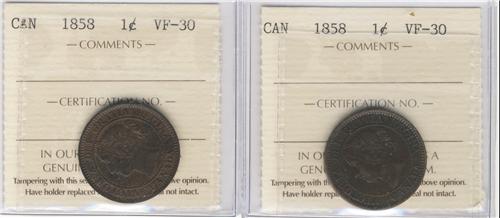 1858 1¢. Lot of two coins both certified ICCS VF30. Both coins sharp with no negative comments