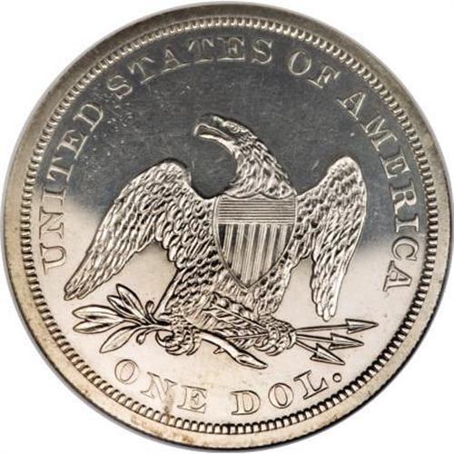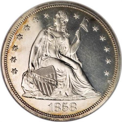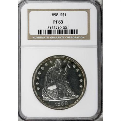 <B>1858 $1 PR63 NGC.</B></I> The 1858 Seated Liberty dollar is a famous proof-only issue in the series. The exact proof mintage is unknown: The Chapman brothers in the late 19th century were purveyors of a figure of only 80 coins. More-modern estimates have ranged from around 200 to as high as nearly 500. (The current <I>Guide Book</B></I> estimate is given as "300+"). Bowers believes that the initial 1858 issue was followed by restrikes in 1859-60, with more possibly made as late as 1876. <BR> Two proof die combinations were used for the issue, both sharing a common obverse showing the date with prominent figures, and different reverses known as the Reverse of 1857 and Reverse of 1859, respectively. The ANS Reverse of 1857 specimen shows die rust on the L of DOL. and beneath, near the rim. This piece also shows reverse die rust, but no other 1857 reverse-die characteristics.<BR> This is a brilliant example that has light hairlines on each side, which account for the PR63 grade, but the piece is fully detailed throughout, as one would expect from a proof striking. It must be stressed that despite the Select grade, this is an extremely rare and highly underrated coin. An edifying comparison with the proof-only 1895 Morgan dollar is in order: NGC has certified only 68 proof examples of the 1858 Seated dollar in all grades, while it has certified upward of 300 proof 1895s. Morgan dollar specialists who are looking to branch out may have much to ponder here ... .<BR><I>From The Queller Family Collection of Silver Dollars.</B></I><BR><BR><B>Coin Engraver:</B> Christian Gobrecht<BR><BR><b>Shipping:</b> Coins & Currency (<a target="_blank" href="http://www.heritageauctions.com/common/shipping.php">view shipping information</a>)