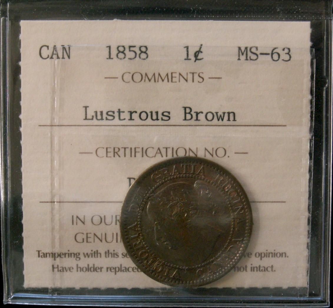 1858 1¢ VG & 1910 1¢ ICCS AU55, 1918 1¢ ICCS AU50 & 1929 1¢ ICCS AU55. Lot of 4 problem, cleaned and/or corroded.
