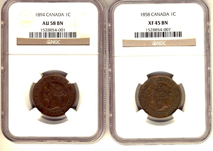 1858 1¢ XF45 & 1894 AU58. Lot of 2 NGC graded coins.