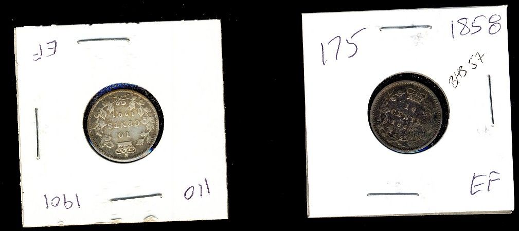 1858 10¢ & 1901 10¢. Lot of 2 coins VF+ to EF. Planchet flaws on 1901.