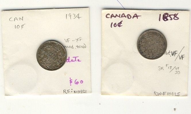 1858 10¢ & 1934 strong VF to VF+. Lot of 2 pcs.