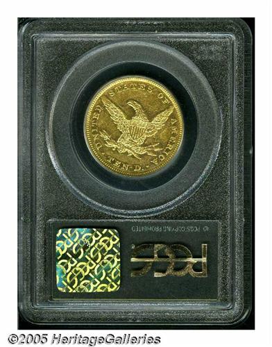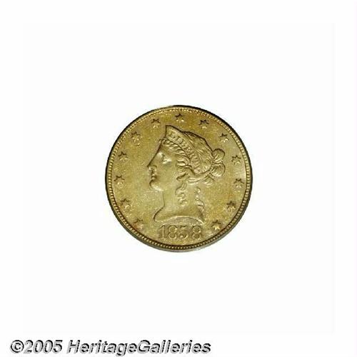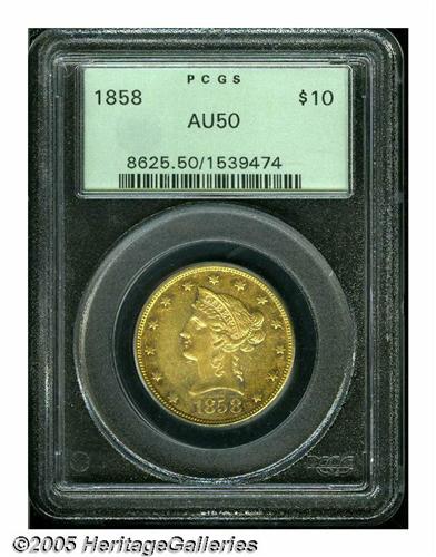 1858 $10 AU50 PCGS. Only 2,521 examples of this i