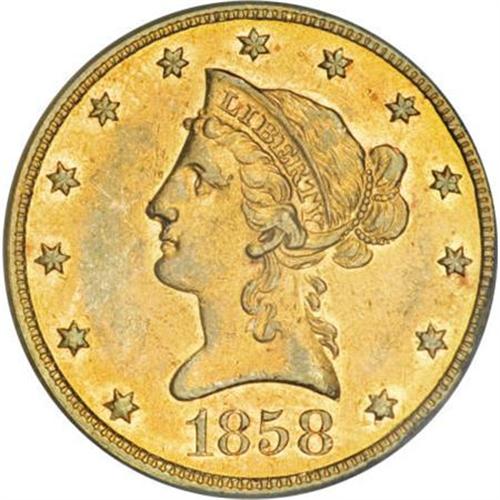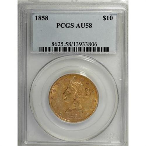 <B>1858 $10 AU58 PCGS.</B></I> Even though it is not the rarest Liberty eagle, the 1858 ten is well-known as a key-date issue, with a business strike mintage of just 2,521 coins. Among No Motto eagles, only three others have a lower mintage. In VF grade, the 1858 has the highest recorded price in the <I>Guide Book.</B></I><BR> Rich orange-gold surfaces and reflective fields are evident on this desirable ten dollar gold piece. Some lighter yellow toning is evident on the fields, with minor abrasions on both sides. Excellent eye appeal and desirability. Population: 1 in 58, 1 finer (12/07).<BR><BR><B>Coin Engraver:</B> Christian Gobrecht<BR><BR><b>Shipping:</b> Coins & Currency (<a target="_blank" href="http://www.heritageauctions.com/common/shipping.php">view shipping information</a>)