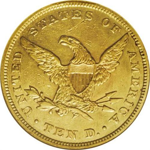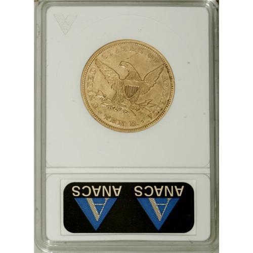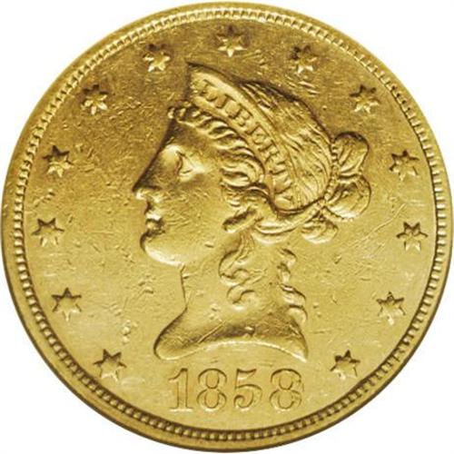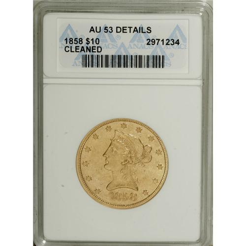 <B>1858 $10 --Cleaned--ANACS. AU53 Details.</B></I> With a mintage of only 2,521 pieces, the 1858 eagle is one of the legendary rarities in the Liberty Head series, although not as elusive as once believed. Jeff Garrett and Ron Guth said, "In reality, the 1858 issue is a scarce coin, certainly the rarest thing since the 1844 eagle, but there are plenty of rarer dates that follow ... . Over 32 examples have appeared at auction since 1994, not to mention an untold number that have been sold privately. That said, the 1858 eagle is still quite difficult to locate in nice condition, since most circulated heavily, became abraded, or were cleaned." This piece did not escape the cleaners' clutches, but much pleasing luster and detail remain on the yellow-gold surfaces. The obverse shows a light scattering of small abrasions. A single scrape above the eagle's head requires mention.<BR><BR><b>Shipping:</b> Coins & Currency (<a target="_blank" href="http://www.heritageauctions.com/common/shipping.php">view shipping information</a>)