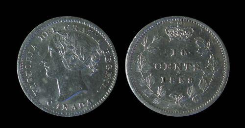 1858 10¢ First 8 over 5 variety ICCS AU55. Fully brilliant and lustrous. Rare variety seldom seen in any grade. The overdate is clear and unmistakable. Only one example graded higher.