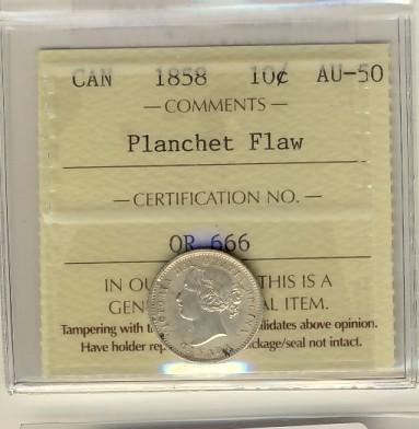 1858 10¢ ICCS AU50. Designated planchet Flaw.