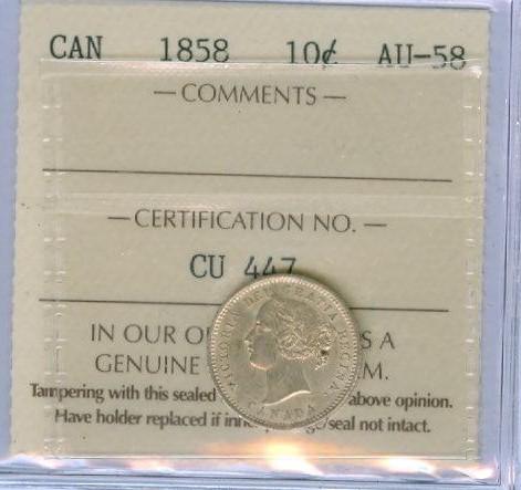 1858 10¢ ICCS AU58 Brilliant!