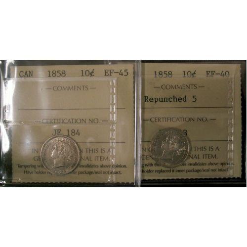 1858 10¢ ICCS EF-45 and 1858 REPUNCHED 5 10¢ ICCS EF-40, two nice coins