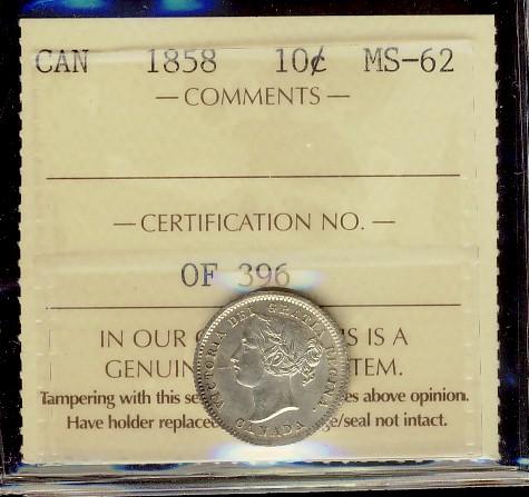 1858 10¢ ICCS MS62, brilliant with lots of lustre.