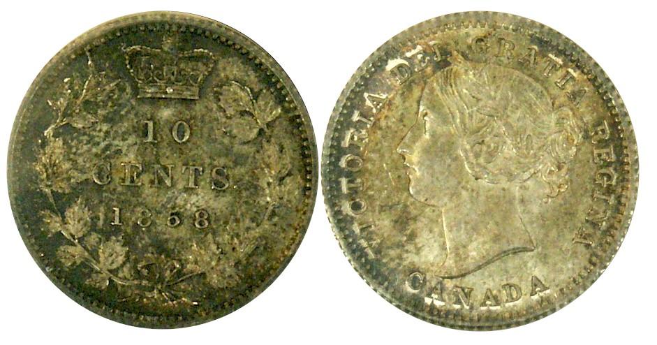 1858 10¢ ICCS MS64. Attractive russet toning. Excellent strike with clean fields and nice surfaces.
